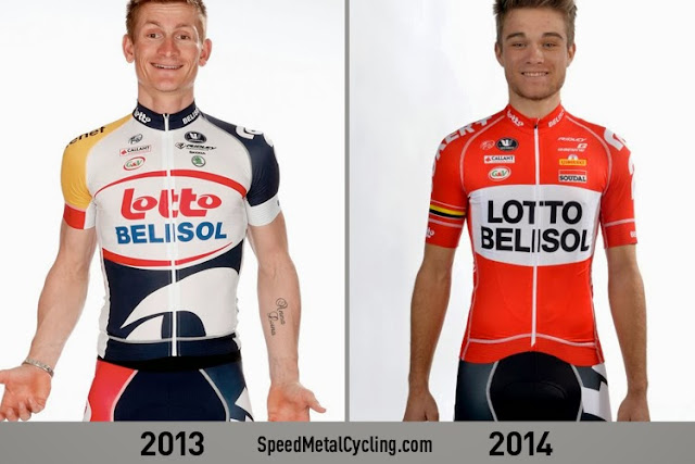 Stealing this photo from the SpeedMetal Cycling folks to illustrate the striking change from 2013 to 2014 from Lotto-Belisol.